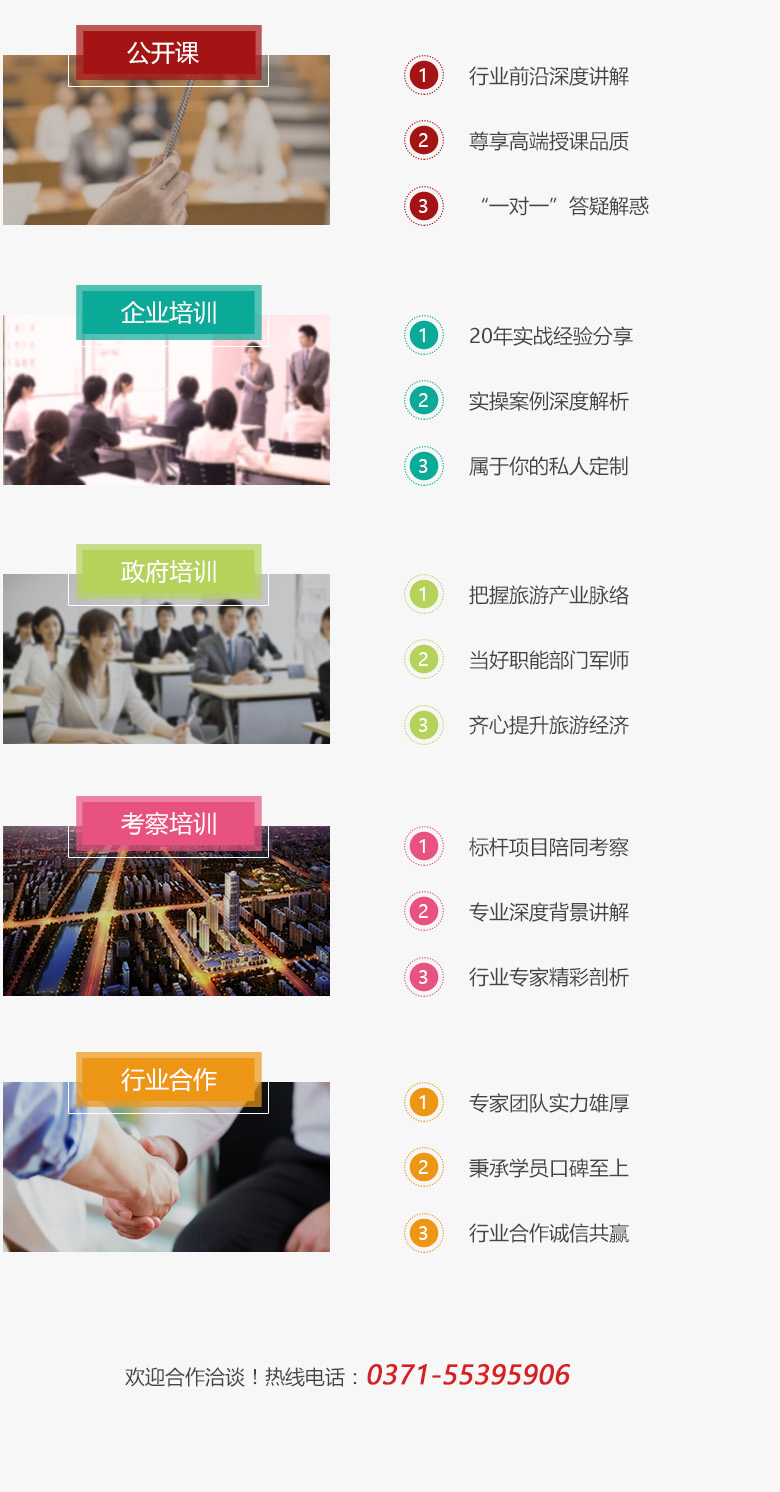 2、針對政府提供:旅游市場營銷、旅游景區(qū)管理、區(qū)域旅游經(jīng)濟等方面的專業(yè)培訓(xùn)講座。