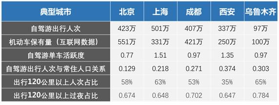 通過(guò)對(duì)比發(fā)現(xiàn),出行人次基本上反應(yīng)了五大城市自駕游游客出行的絕對(duì)關(guān)系。出游人次最多的是上海和北京,最少的是烏魯木齊。同時(shí)為了尋找自駕游出游人次和某些客觀因素的相關(guān)性時(shí),我們參考了各地的機(jī)動(dòng)車保有量和常住人口。我們發(fā)現(xiàn),當(dāng)出行人數(shù)與機(jī)動(dòng)車保有量的比值越大時(shí),意味著人們出游更多的依賴私家車,從一個(gè)側(cè)面反映了節(jié)假日出游時(shí)道路的擁堵程度。我們也可以看出西安是一個(gè)自駕游出行更為活躍的城市,因?yàn)槌鲂腥丝谙鄬?duì)于西安的人口和機(jī)動(dòng)車保有量而言比值很高,但是大多數(shù)出行集中在短途。最后當(dāng)我們分析出行距離與出行人次和過(guò)夜人次的關(guān)系時(shí)主要反映交通的便利程度是否方便人們?cè)诒M可能的時(shí)間內(nèi)返回出發(fā)地。烏魯木齊在對(duì)比中呈現(xiàn)趨于中長(zhǎng)線自駕游的趨勢(shì),其長(zhǎng)途出行比例和過(guò)夜率均為五城市最高。