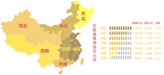 2017年上半年人均自駕出游次數(shù)為1.4次。從全國(guó)七大經(jīng)濟(jì)區(qū)出游人次來(lái)看,華東、華中、華北地區(qū)的出游人次分別占據(jù)全國(guó)出游總?cè)舜蔚那叭鞑考氨辈康貐^(qū)則排名靠后。從宏觀角度講,我們假設(shè)這與省份、人口、經(jīng)濟(jì)發(fā)展水平甚至城際公路建設(shè)有著密不可分的關(guān)系。